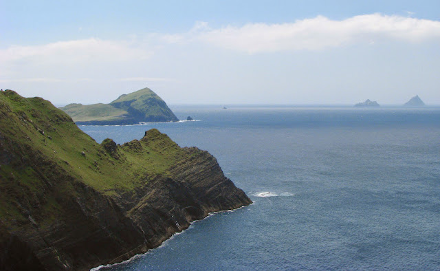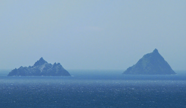 World Heritage Site of Skellig Michael on the right along with Small Skellig. There live a large colony of gannet & puffin populations, and a monastery perched high on Skellig Michael.